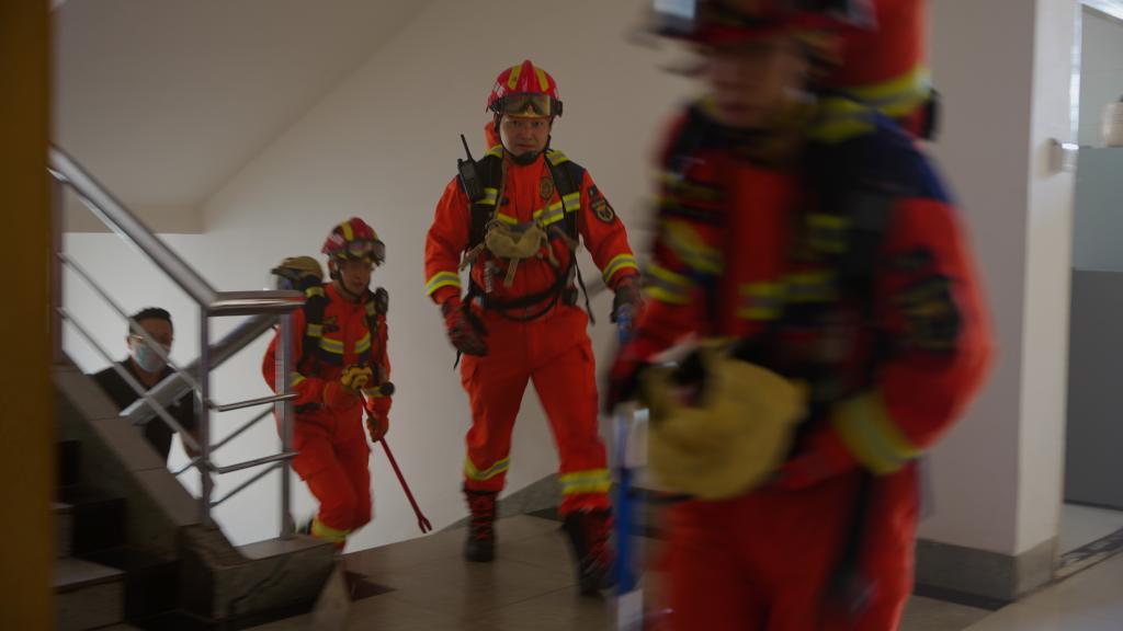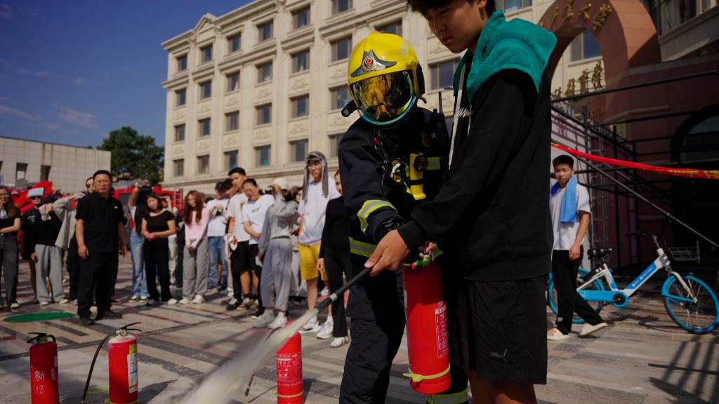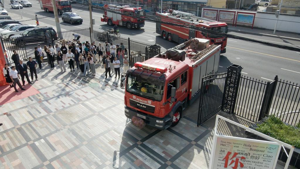 本次活动涵盖疏散演练、消防装备器械展示与讲解、消防救援装备实操三大环节。在疏散演练中,来华职工在教师与工作人员的引导下,沿预定路线迅速有序地向安全区域撤离。在消防装备展示环节,消防救援专业人员重点介绍了包括音视频生命探测仪,复合气体检测仪和液压破拆工具组在内的多种先进装备。在专业人员的指导下,来华职工们轮流体验了灭火器扑救初起火灾的过程,并尝试佩戴逃生设备进行模拟逃生。来自巴基斯坦的职工瑞恩表示:“这是我第一次实际操作灭火器,真正感受到了消防安全的重要性。”