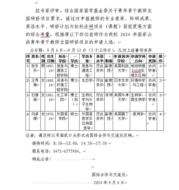 关于太阳成集团122ccvip2024年国家公派青年骨干教师出国研修项目评审结果的公示