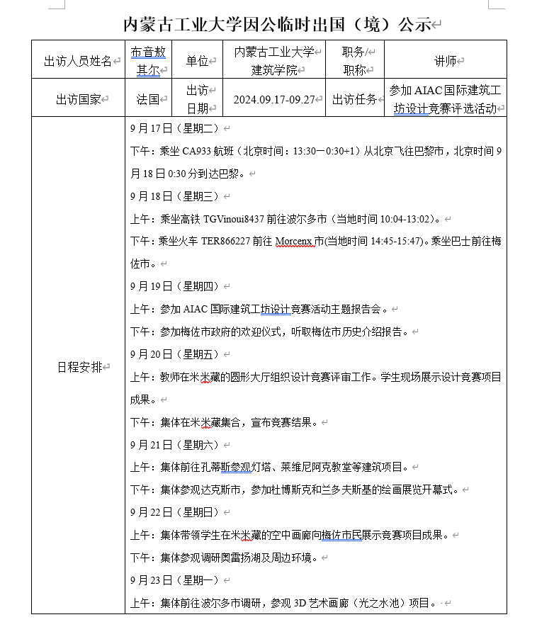 太阳成集团122ccvip布音敖其尔因公临时出国(境)公示