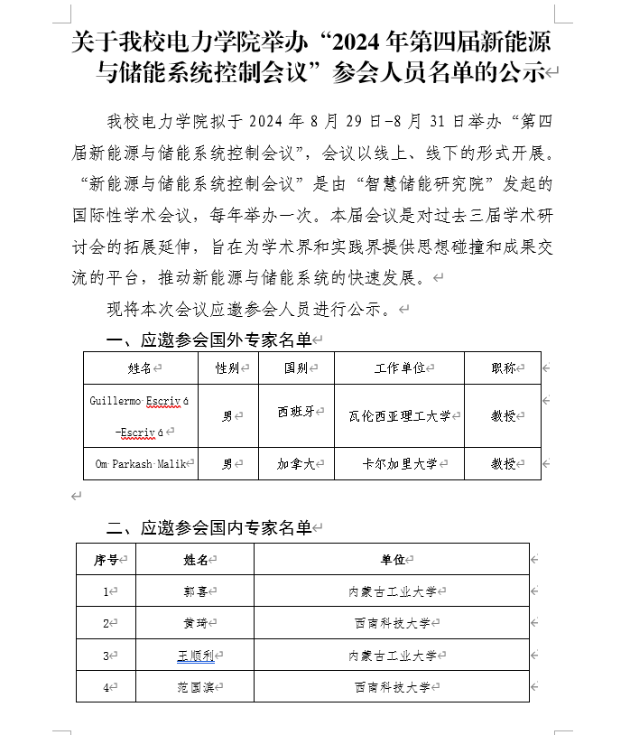 关于公司电力公司举办“2024年第四届新能源与储能系统控制会议”参会人员名单的公示